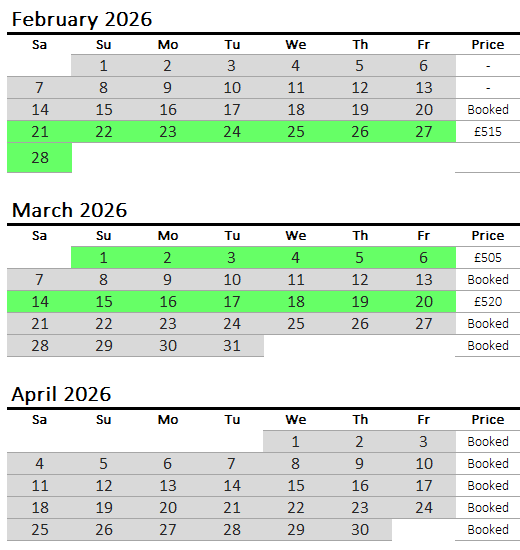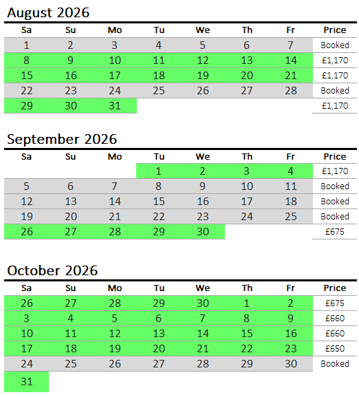 All prices quoted on the availability calendar are for 1 week & changeover day is Saturday with arrival after 4pm & departure before 10am