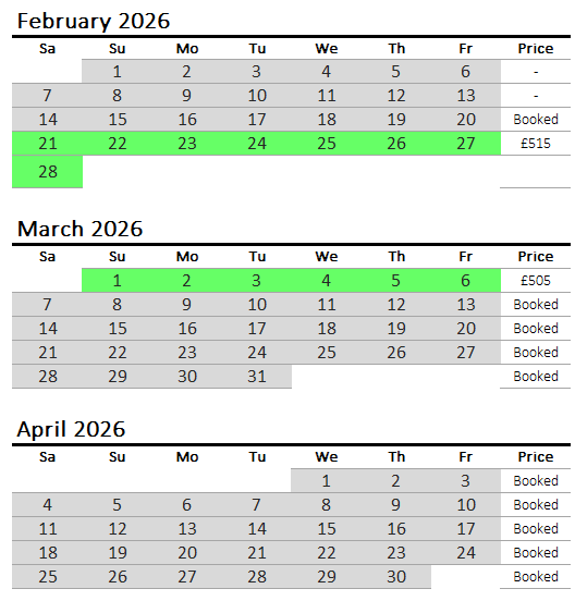 All prices quoted on the availability calendar are for 1 week & changeover day is Saturday with arrival after 4pm & departure before 10am